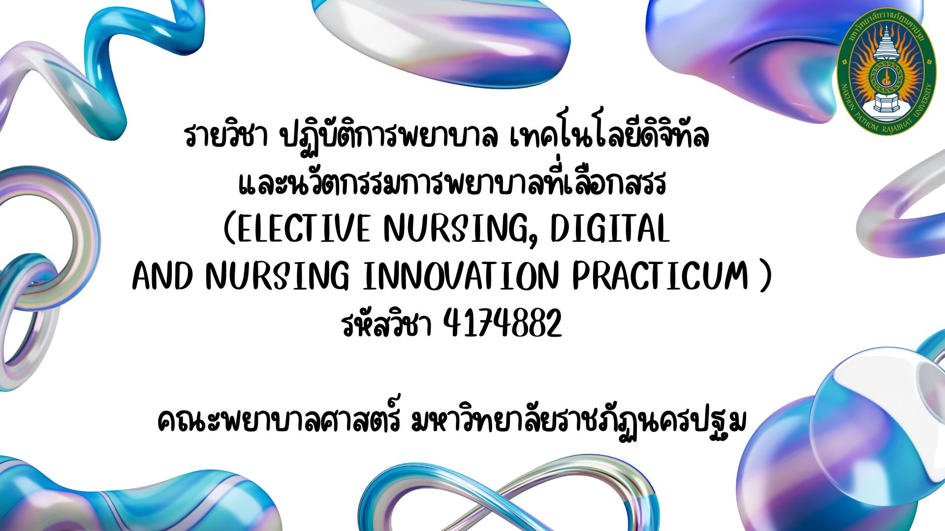 แนวคิด ทฤษฎีสารสนเทศทางการพยาบาล เทคโนโลยีดิจิทัลด้านสุขภาพ การสร้างทักษะทางด้านดิจิทัล ความสามารถออกแบบทางดิจิทัล ฐานข้อมูลการพยาบาล ระบบจำแนกทางการพยาบาล การใช้เทคโนโลยีและเทคโนโลยีดิจิทัลด้านสุขภาพเพื่อการจำแนกรวบรวมในการปฏิบัติการพยาบาล นวัตกรรมทางการพยาบาล วิธีการพัฒนานวัตกรรมทางการพยาบาล การประยุกต์ใช้นวัตกรรมทางการพยาบาลและสื่อสังคมในการปฏิบัติการพยาบาล สิทธิมนุษยชน กฎหมาย และจรรยาบรรณที่เกี่ยวข้อง